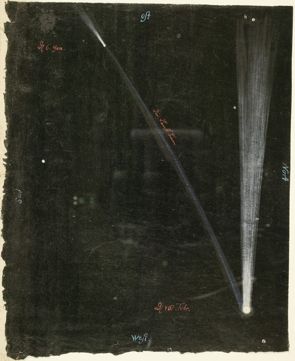 Der Komet von 1744 war am 9. Dezember des Vorjahres entdeckt worden, die letzte bekannte Beobachtung stammt vom 22. April 1744. Im Gedächtnis geblieben ist er vor allem wegen seines breit aufgefächerten Schweifes. Johann Gabriel Doppelmayr machte Rösel von Rosenhof am 6. Januar auf den Kometen aufmerksam, woraufhin der ihn aufmerksam beobachtete. Im Folgenden entwickelte er eine eigene Theorie über die Entstehung der Kometenschweife. Dass Rösel kein begnadeter Astronom war, zeigt aber seine Darstellung der Kometenbahn: Der Komet umkreist hier nicht die Sonne, sondern einen Planeten.